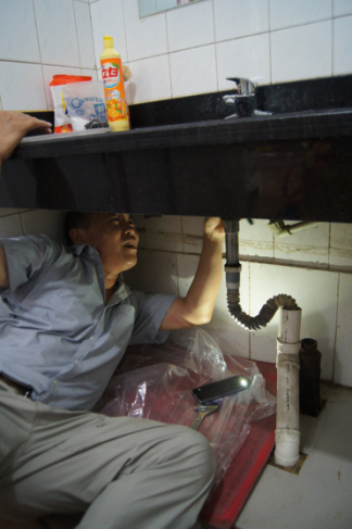 7月6日下午2時,在順河街一處網點房的洗手間里,54歲的唐建民斜倚在地上,費力地將頭伸入洗手盆的下面,維修壞掉的下水管道。當天,室內溫度大約在35攝氏度左右,狹小無窗的洗手間溫度更高。在手機手電筒微弱的光線下,唐建民認真地工作著,難聞的味道與難耐的高溫仿佛對他沒有影響——如果忽略不停滴落的汗水的話。